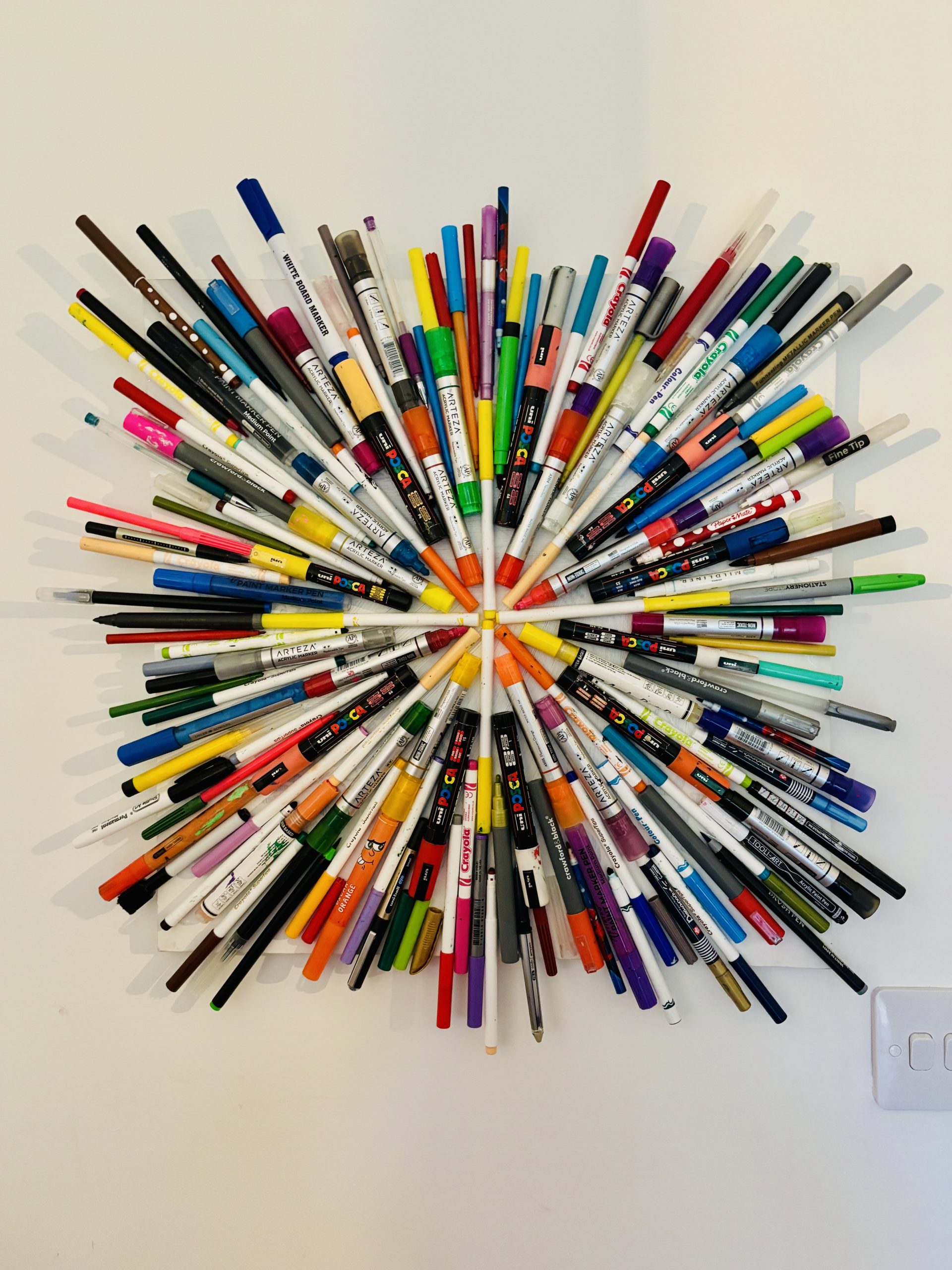 Nancy, our director, has been keeping her used pens over the past two years to create a wonderful piece of art to donate to Repair Café Havant as a really representative symbol of their ethos of reusing what many consider rubbish or waste for creative purposes. Nancy says “I always save all our empty pens in my pen grave yard, when I have enough I make art and donate it to a local community group or charity. This is around two years of empty pens simply added to a repurposed canvas.”